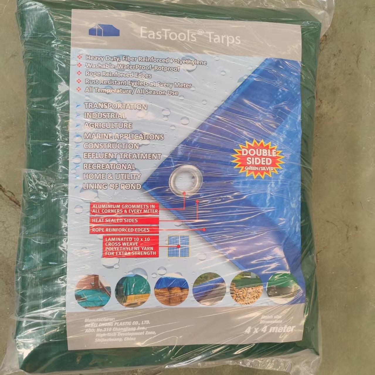 Ready Made Tarpaulin Sheet, Each tarpaulin folded an put in a transparent polybag, a paper label insert, suitable pieces packed in a bale or in a carton or in a display box